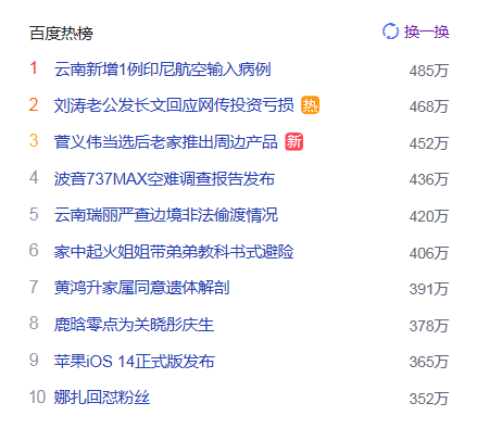 1. 云南新增1例印尼航空輸入病例 獵頭熱點(diǎn)熱度485萬