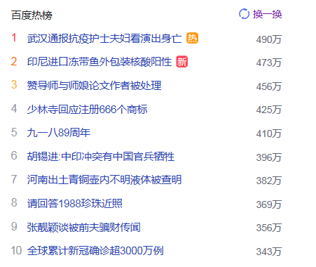 1. 武漢通報抗疫護士夫婦看演出身亡 獵頭熱點熱度490萬