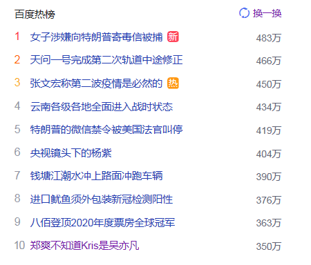 1.女子涉嫌向特朗普寄毒信被捕 獵頭熱點(diǎn)熱度483萬