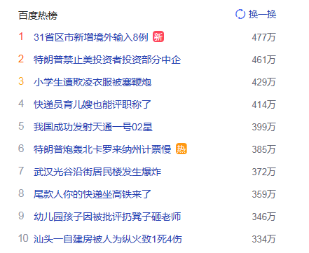 1. 31省區(qū)市新增境外輸入8例 獵頭熱度熱點477萬