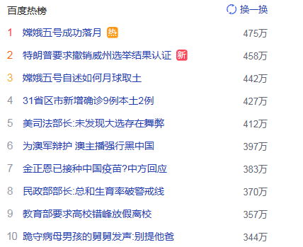 1. 嫦娥五號(hào)成功落月 獵頭熱度熱點(diǎn)475萬