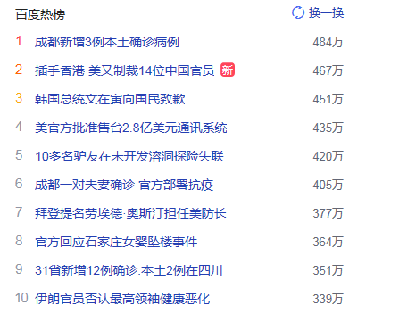 1. 成都新增3例本土確診病例 獵頭熱度熱點484萬