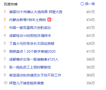 1. 美國50個州確認(rèn)大選結(jié)果 拜登大勝 獵頭熱度熱點491萬