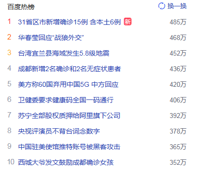 4. 成都新增2名確診和2名無(wú)癥狀患者 獵頭熱度熱點(diǎn)436萬(wàn)